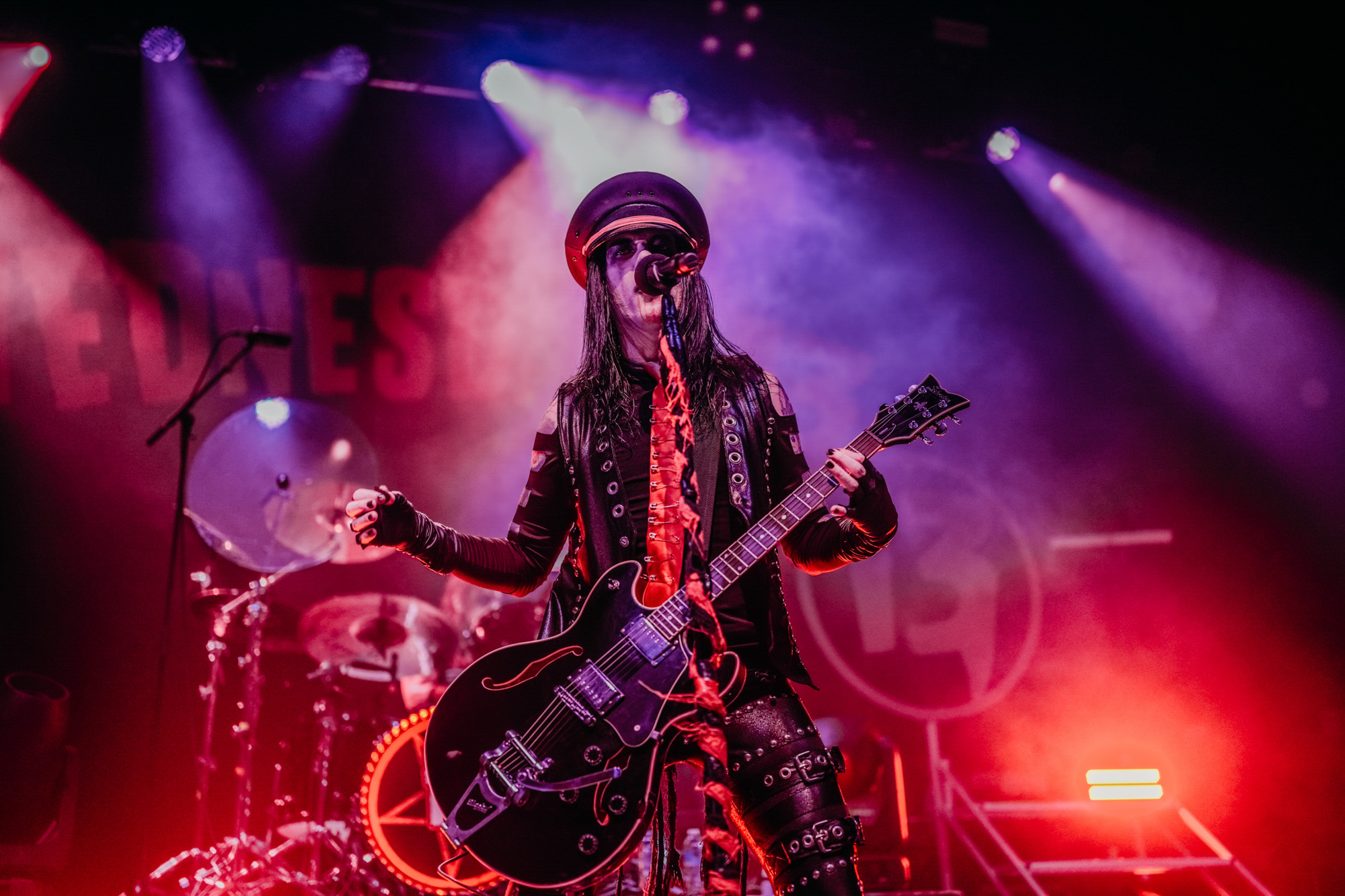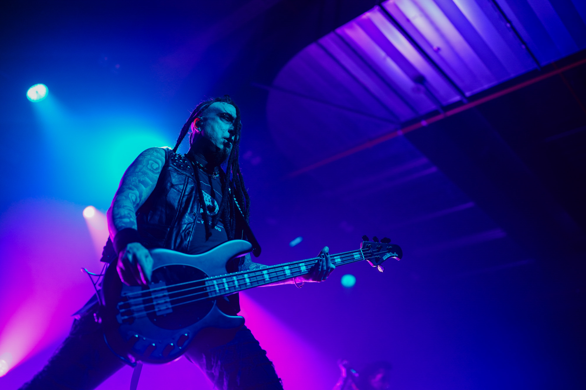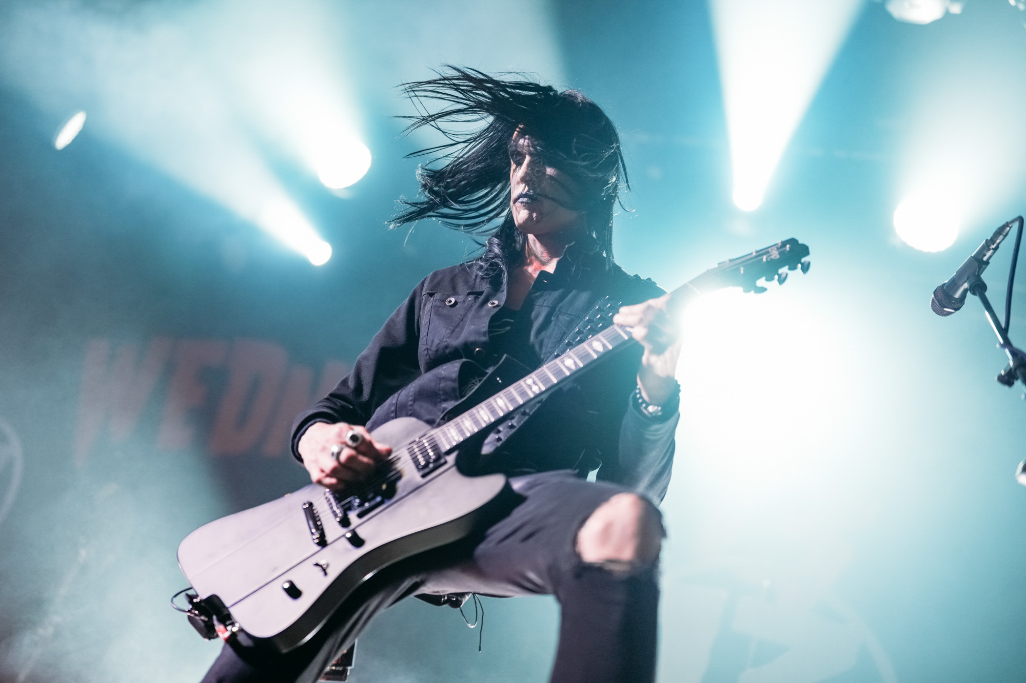 The first is light, or lack thereof. Whether you’re shooting in a dimly lit bar (where most of us started) or capturing a brightly lit arena show, a wide aperture will help you maximize available light in the best ways possible. Wednesday 13’s show ranges from bright white and yellow lights to deep purples and blues, and the wide aperture helps me keep everything looking well-lit. I can also very easily increase my shutter speed to capture all of the fast paced action, as this is not a band that stands still!