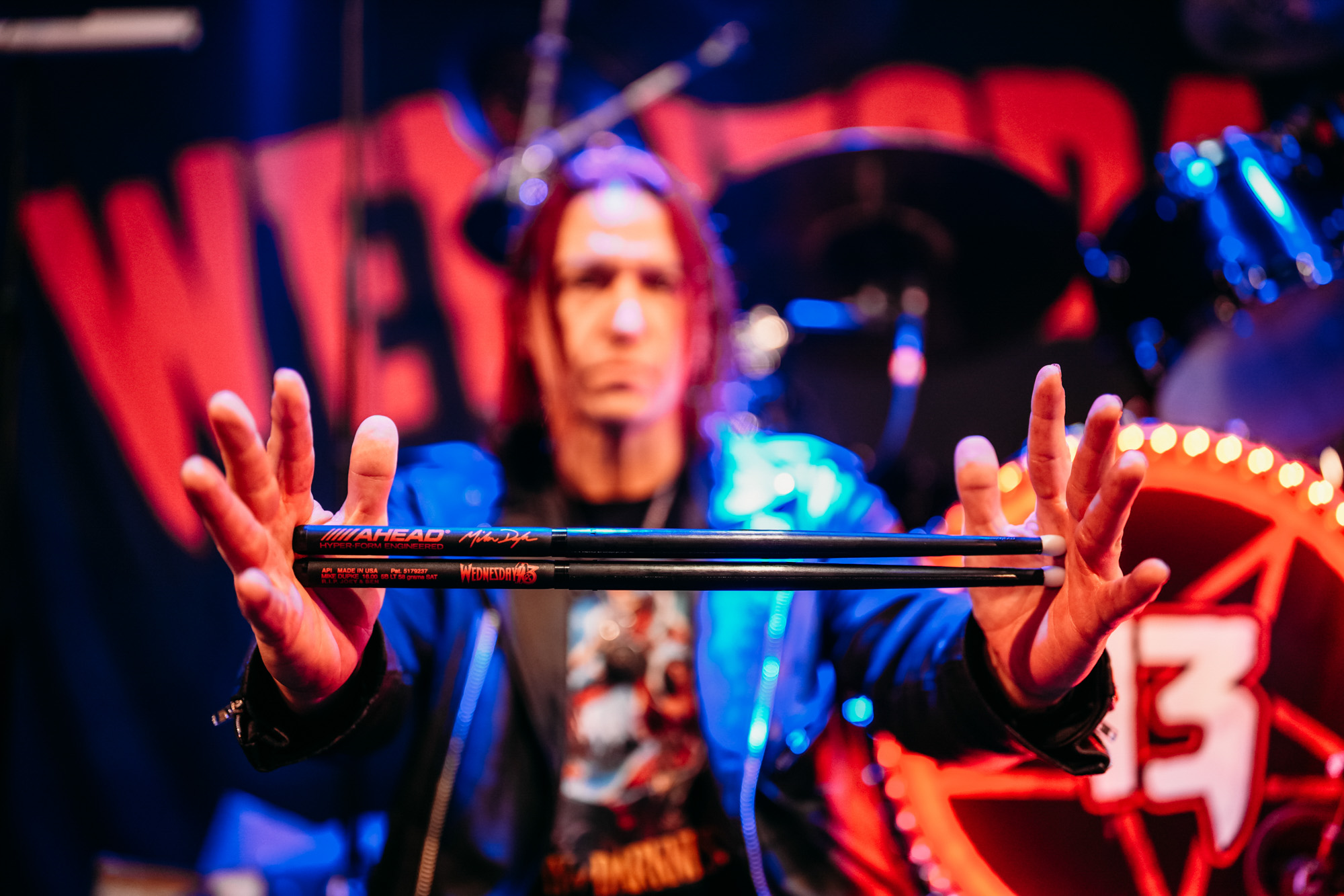 My first opportunity to even have an impression took place during Wednesday 13’s production rehearsals in Wolverhampton, England, at the famous KK’s Steel Mill (a music venue established by English Grammy Award winning guitarist, songwriter and a founding member of the band Judas Priest). I’m not usually a part of rehearsals before a tour, so this was a unique opportunity to get my bearings on my equipment while the band and crew got their bearings for everything else!