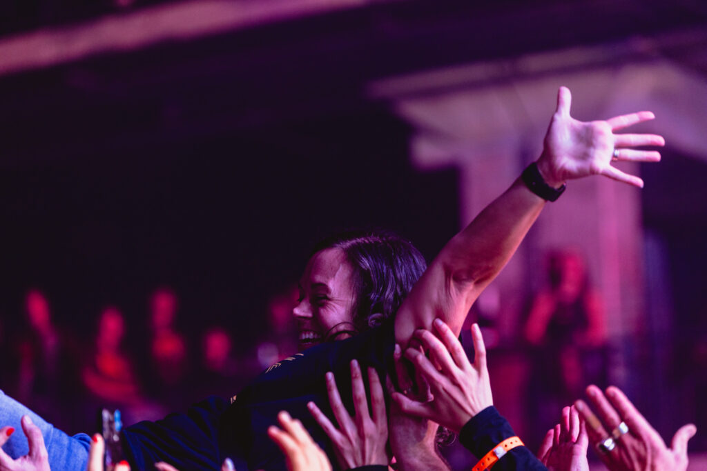 One of my favorite things to do during those moments was slide on stage, hide behind the guitar amps, and zoom in on crowd surfers and moshers having the time of their lives — all while staying safely out of the way. Live music brings out so many emotions, and with this lens, I could capture those moments without being intrusive.