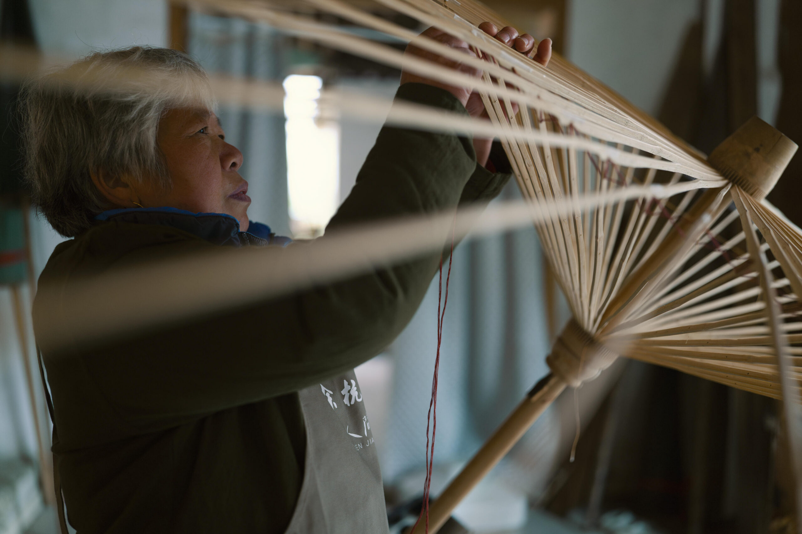 Because the working environment on site was relatively cluttered, I relied almost exclusively on shooting wide open. This allowed me to isolate precise movements of the artisans’ fingertips or highlight the intricate structure of the umbrella ribs. The plane of focus locks accurately onto the subject, while the out-of-focus areas are rendered softly and smoothly, creating a clear yet gentle contrast between sharpness and blur with strong depth and layering.