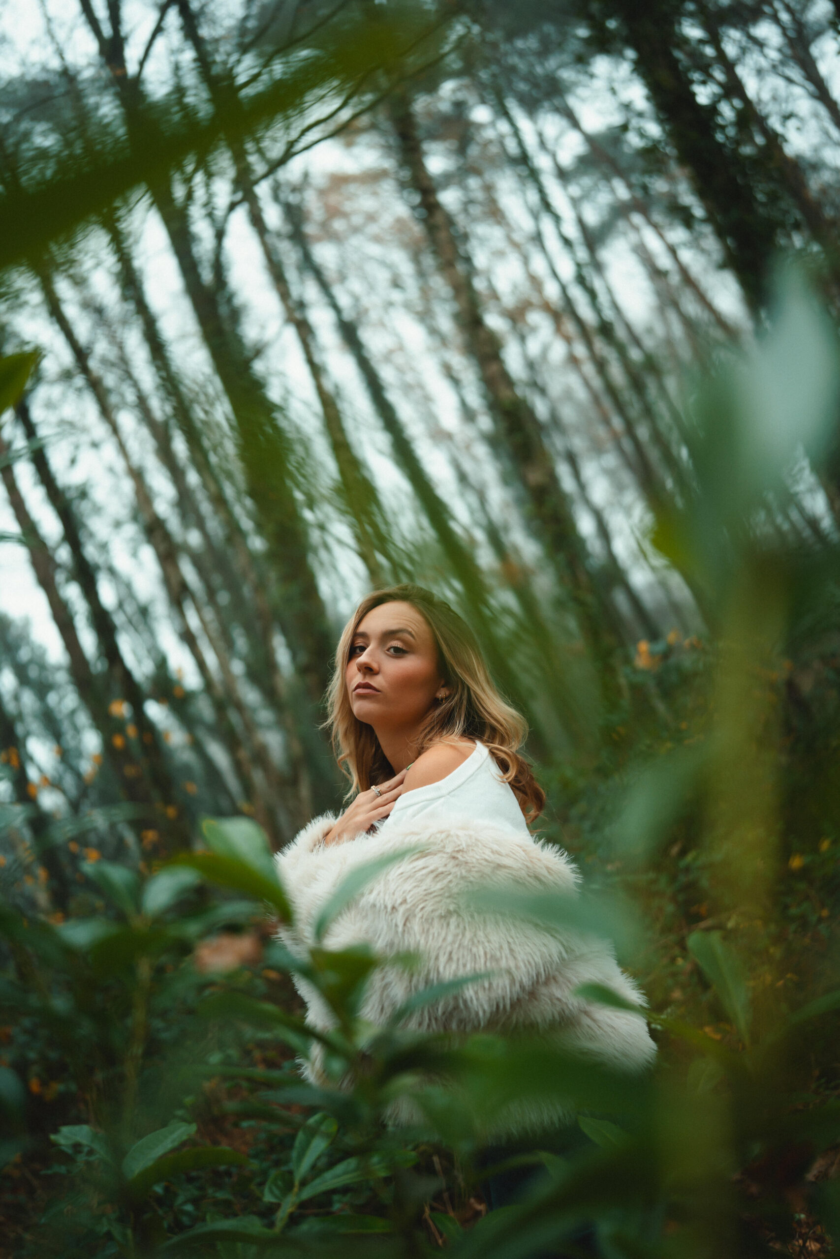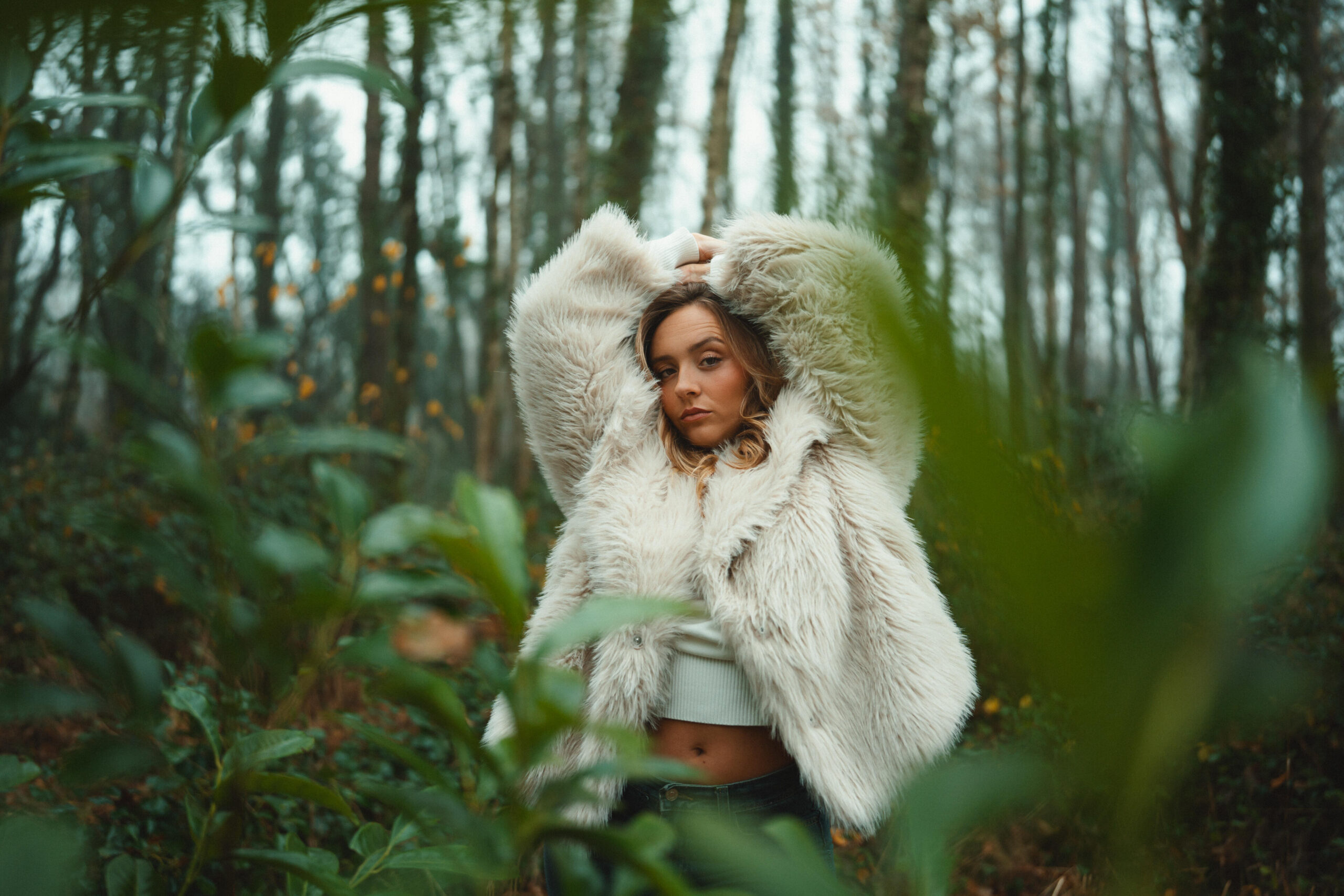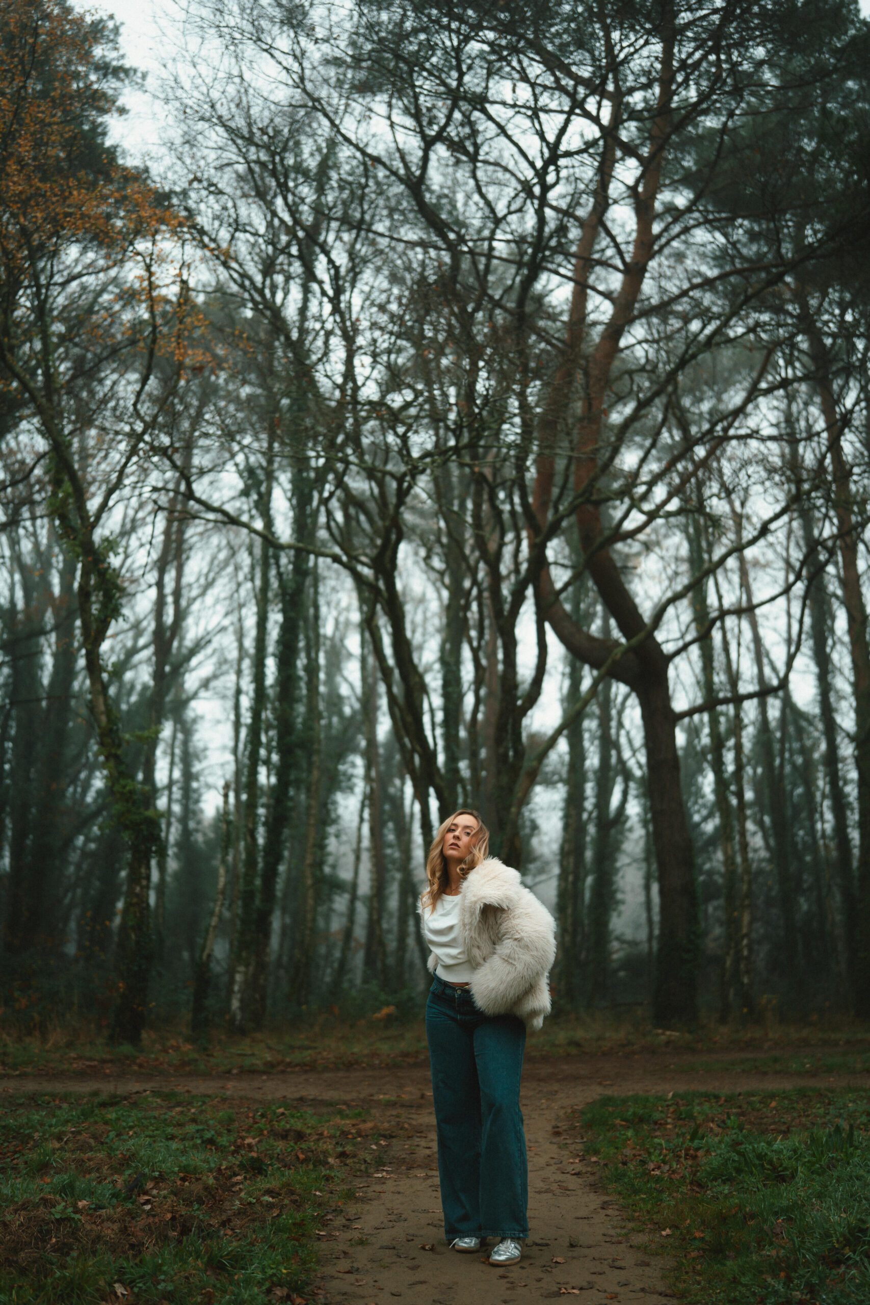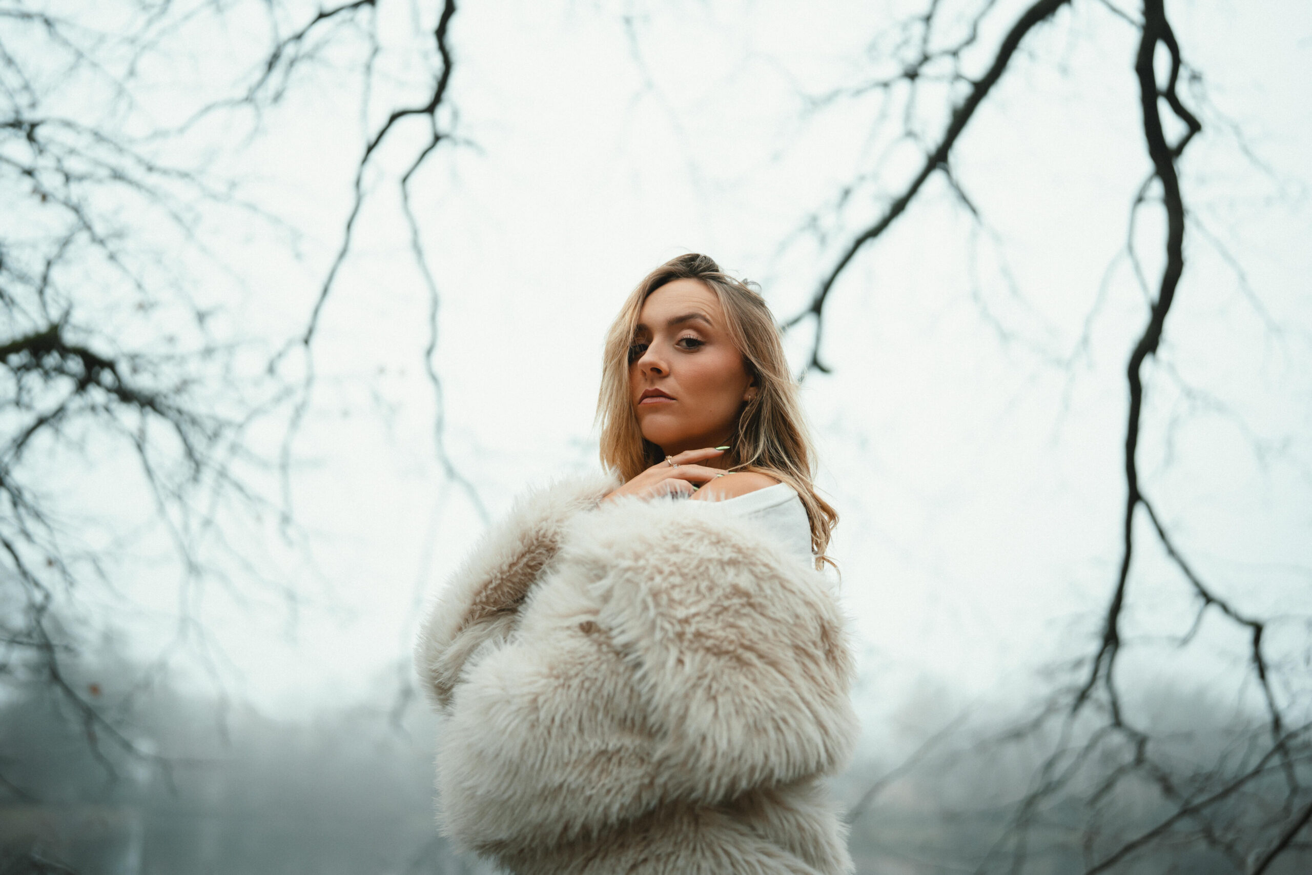 For the outdoor shoot, the winter season was a major source of inspiration. I wanted to capture this time of year with a misty atmosphere, conveying both calm and mystery. The forest creates a sense of space and vastness, giving the impression of being alone in nature. My goal was to create portraits that interact with the environment, playing with the model’s poses to enhance the strength of the images, while leaving room for the scenery. The mist, trees, and winter tones naturally bring depth and poetry to the shots.