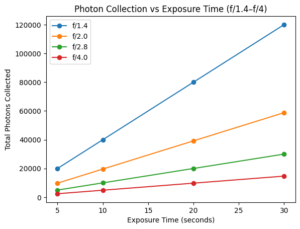 This is sometimes lost in how we measure light in cameras. We use “stops” to express the difference in exposure when we change our settings, but stops are exponential in nature, so the difference in total light gathered is compounded over a longer exposure time. The graph below shows the difference in absolute light captured at different exposure times at different apertures. As you can see, having an F1.4 lens is a huge advantage even over the generally accepted professional standard of F2.8 when creating long exposure images.